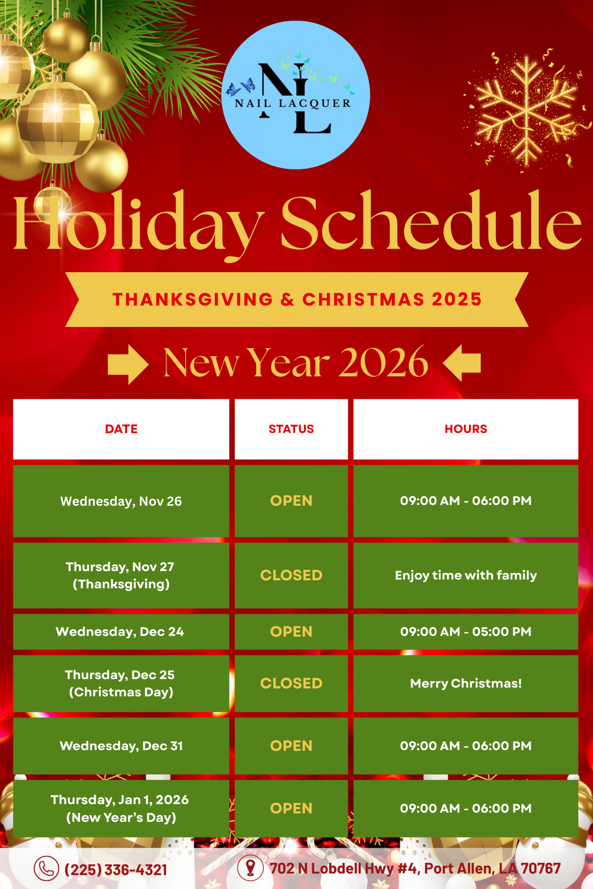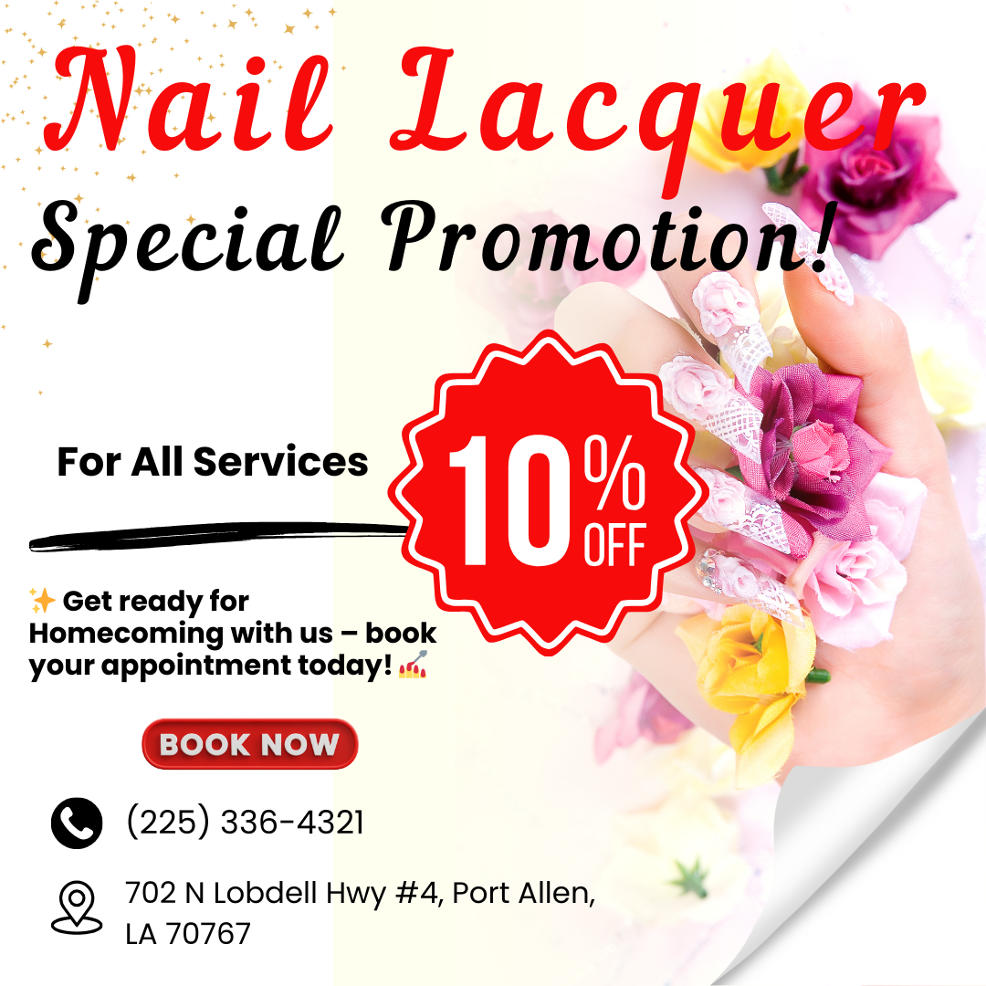 Are you looking for a reliable nail salon to perform nail and spa services? Look no further, Nail Lacquer is the ideal location. Visit us at 702 N Lobdell Hwy #4, Port Allen, LA 70767, for beauty treatments and find yourself looking even more beautiful with a stylish look!