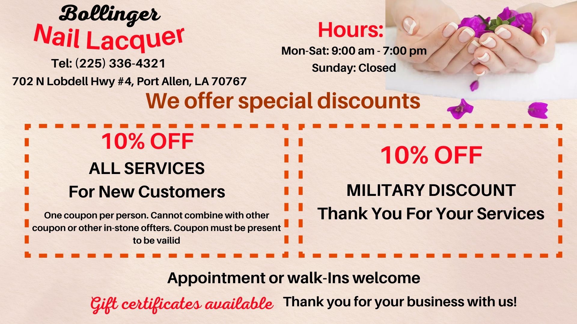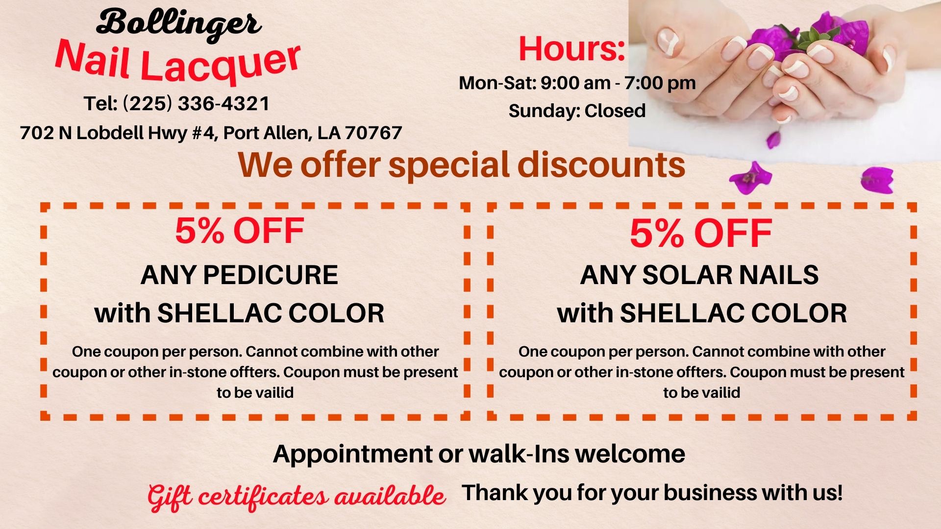 Are you looking for a reliable nail salon to perform nail and spa services? Look no further, Nail Lacquer is the ideal location. Visit us at 702 N Lobdell Hwy #4, Port Allen, LA 70767, for beauty treatments and find yourself looking even more beautiful with a stylish look!